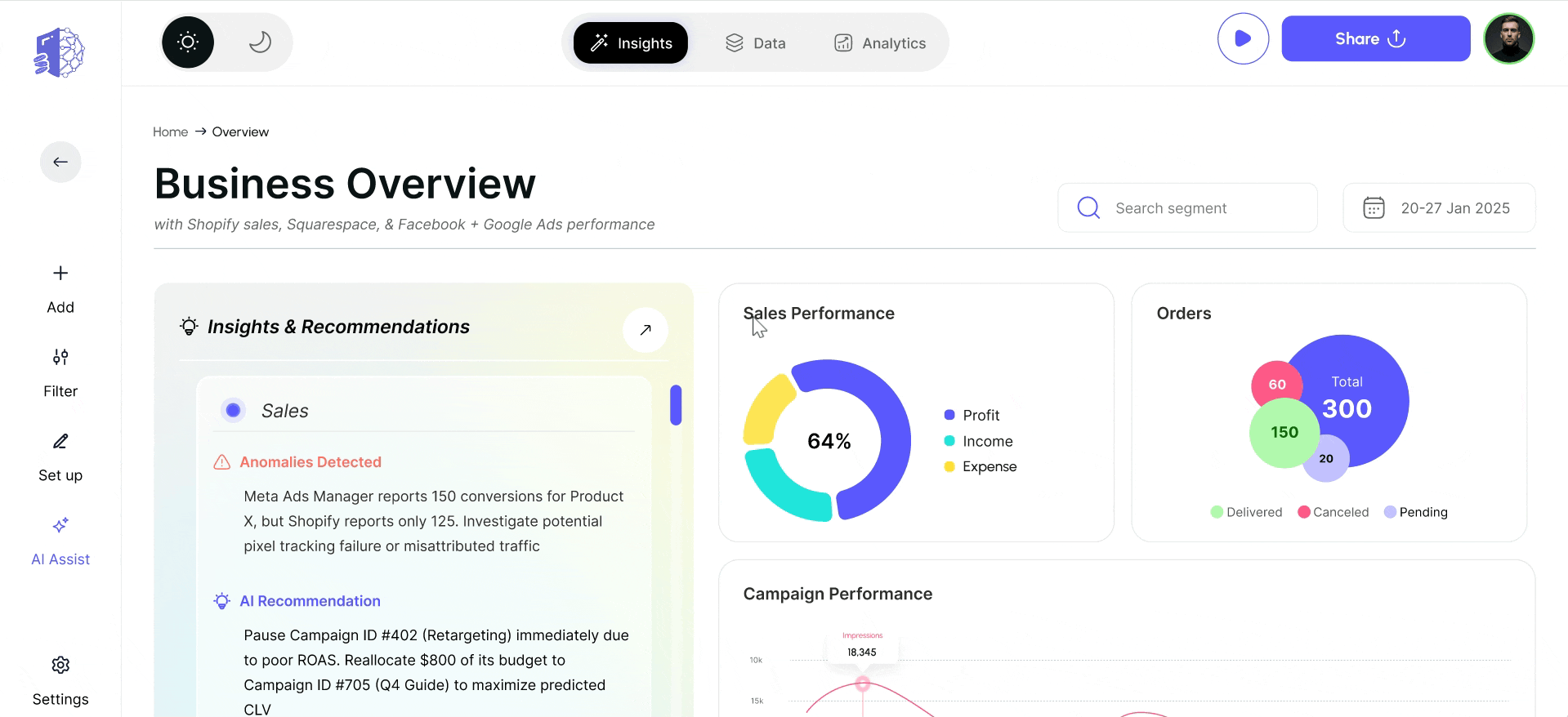 Let AI handle the next step. Your AI copilot doesn’t just advise, it acts. Launch campaigns, update pricing, or tweak ads directly from insights.
